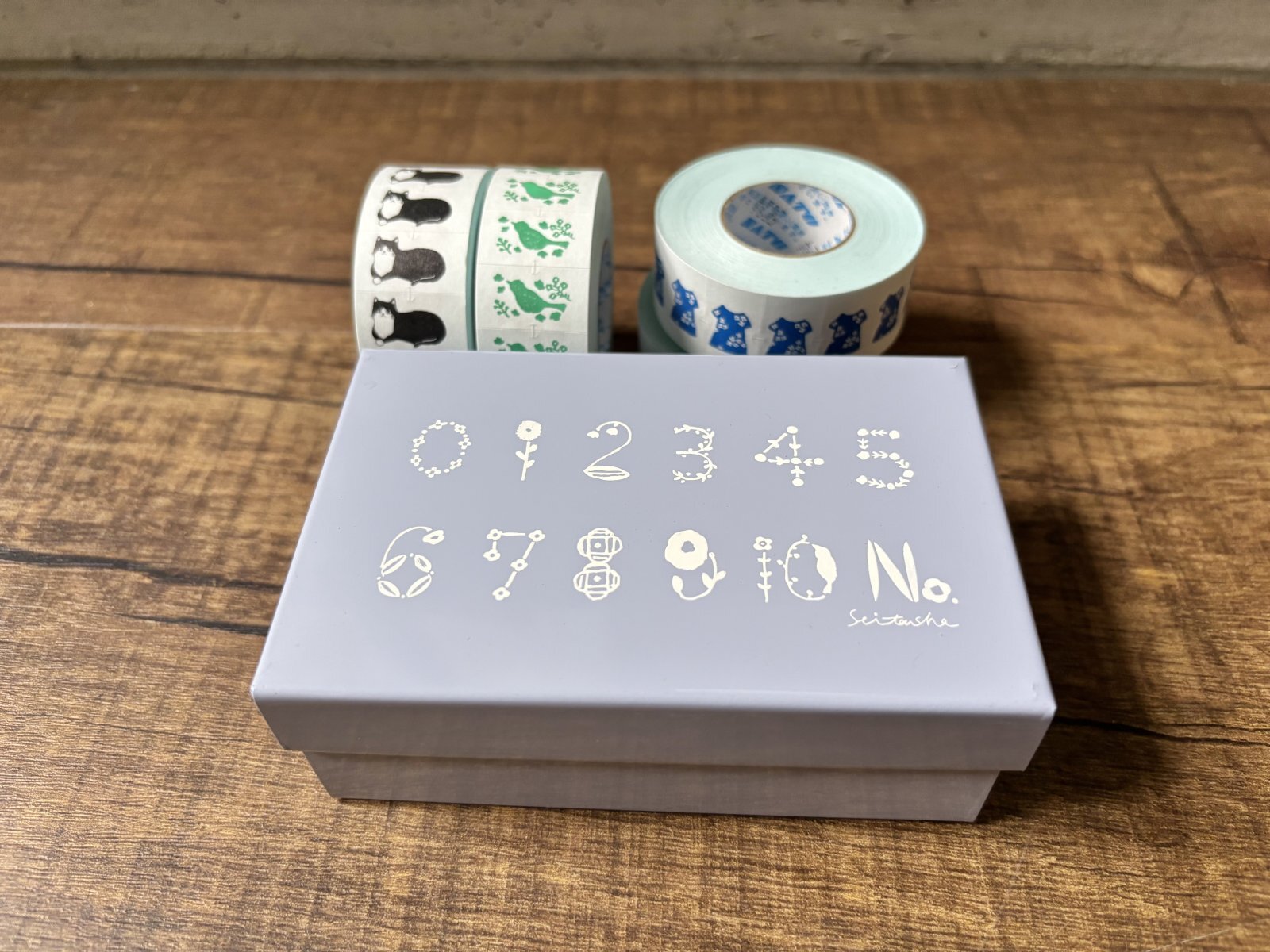 星燈社の新作ラベラーロールシール4柄を、展覧会限定の角缶『花数字』に詰め合わせました。